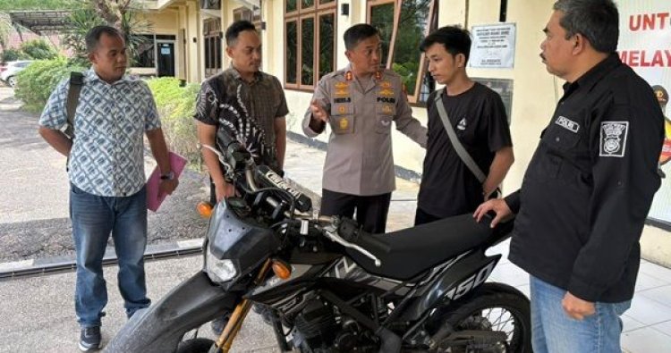 Andri pun dengan penuh suka-cita menyambut penyerahan sepeda motor miliknya yang berhasil ditemukan polisi.