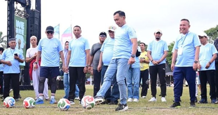 JAMBI – Sepakan si kulit bundar oleh kaki kanan Inspektur Pengawasan Daerah (Irwasda) Polda Jambi Komisaris Besar Jannus P Siregar, menyemarakkan penyambutan Kick Off World Cup 2026 yang digelar usai senam sehat bersama di Halaman Kantor Gubernur Jambi, Minggu pagi (1/2/2026).